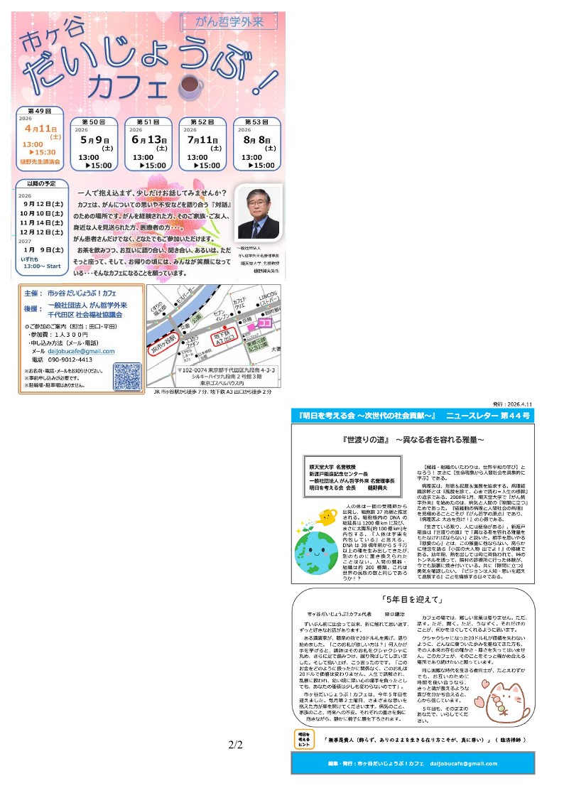 2026年4月11日【『がん哲学外来 市ヶ谷だいじょうぶ!カフェ』(代表者:田口謙治氏・担当者:田口桂子氏)】に赴いた(画像)。 今年は、5周年とのことである。 多数の参加者であった。 お母様がご逝去された『中学2年生の娘様と お父様』が演奏された。 大いに感動した。 娘様が、小学生に時、筆者は、お母様と個人面談をしたものである。 筆者は、講演では 複数の質問も寄せられた。 講演後、筆者は別室で、4組の個人面談の機会が与えられた。 会場で ニュースレター【『明日を考える会 〜 次世代の社会貢献 〜』第44号】が配布されていた。 筆者は、『明日を考える会 会長』として 下記の文章【『世渡りの道』 ~異なる者を容れる雅量~】が紹介されていた (画像)。