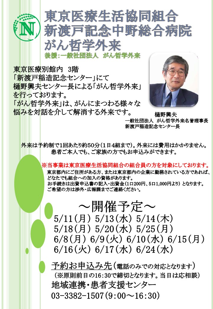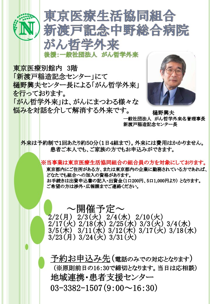 新渡戸記念センターは医学博士樋野興夫先生をセンター長に据えた「がん哲学外来」を主とするがんに関する悩みを相談するセンターです。