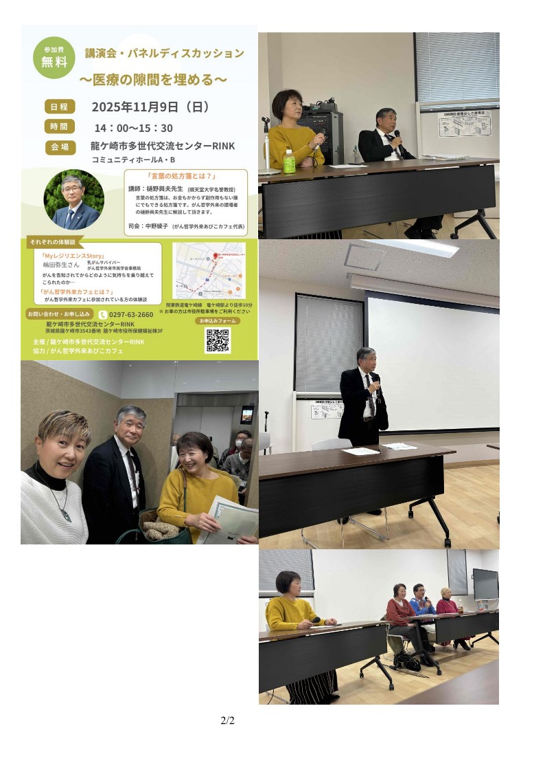 2025年11月9日 ひばりヶ丘駅 ―> (西武池袋線) ―> 池袋駅 ―> (JR山手線) ―> 日暮里駅―> (JR常磐線) ―> 龍ケ崎市駅 に赴いた。 龍ケ崎市多世代交流センターでの【講演会・パネルデイスカッション 〜 医療の隙間を埋める 〜】(画像)に出席した。