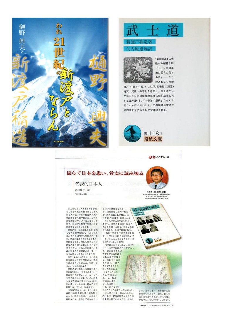 筆者は2001年から『がん哲学』を提唱し、最初の著作は『われ21世紀の新渡戸とならん』(2003年11月10日発行:イーグレープ 発売:いのちのことば社)である(画像)。 2007年『東久留米のインターナショナルスクール(CAJ)』で、新渡戸稲造著『武士道』、内村鑑三(1861-1930)著『代表的日本人』の読書会を始めた(画像)。【『良書を読み、有益な話を聞き、心の蔵を豊かにする』(新渡戸稲造)】の実践である。 2008年1月順天堂大学の病院の診察室で、無料の『がん哲学外来』を始められ、2008年秋 院外での『がん哲学外来』もスタートした。