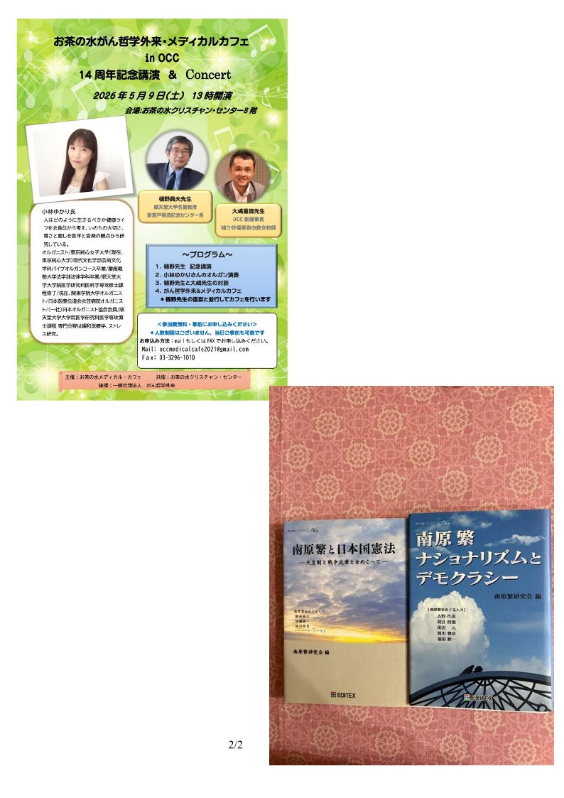 2026年5月9日 【『お茶の水がん哲学外来・メディカルカフェin OCC』14 周年記念講演 & Concert』】(お 茶 の 水 クリスチャン・センター に於いて) (添付)で、オルガン演奏される 小林ゆかり氏(順天堂大学大学院医学研究科医学専攻博士課程に在籍中)から、4月1日【樋野興夫先生 『南原繁と日本国憲法』(南原繁研究会編2011年発行) &『南原繁ナショナリズムとデモクラシー』(南原繁研究会編2010年発行)の2冊を持っております (添付)。『ナショナリズムとデモクラシー』では、冒頭に 樋野先生の文章がありました。】との連絡を頂いた。 大いに感動した。 筆者は、『南原繁ナショナリズムとデモクラシー』の『はじめに』に【人生の起点 ― 悲しい出来事、 邂逅 ― 人生の機軸、 プロセスがあって時間がかかる ― 30年、 南原繁の温故創新 ― 『政治哲学者』から『がん哲学者』へ】を記述したものである。『生きている限り、人には使命がある』を実感する日々である。
