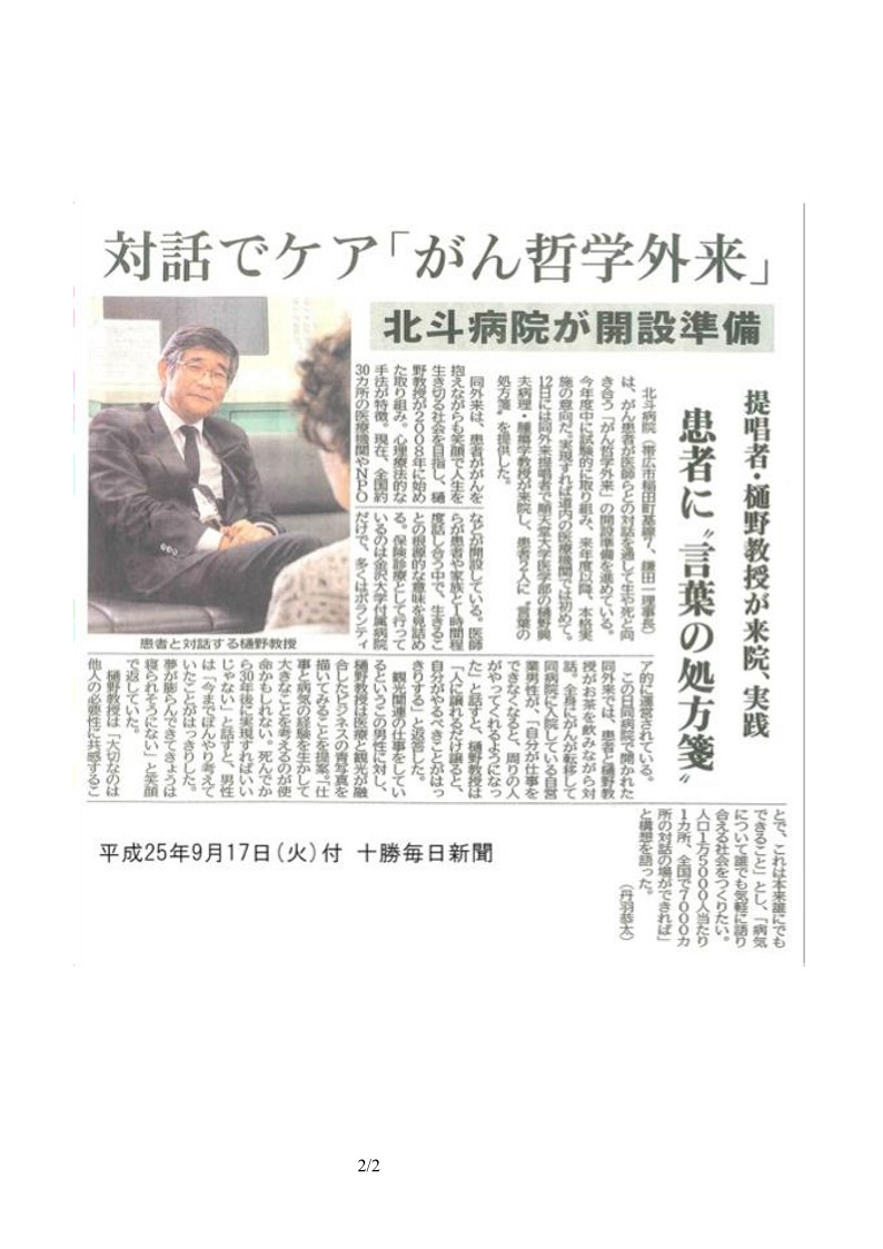 病理学は【『臨床と基礎の懸け橋 =本質的な人間教育の見直し』】の実践であろう! 今回、西原広史先生(慶應義塾大学医学部がんゲノム医療センター 教授)が、筆者の講演『がん哲学外来の教え』の座長をして頂く。 想えば、2013年北海道の帯広市の北斗病院で、西原広史先生の計らいで、講演の機会が与えられた (添付)。 2014年4月19日の十勝毎日新聞でも『病気や生死と向き合う 北斗病院で がん哲学外来』に掲載されたのが、鮮明に蘇ってきた。